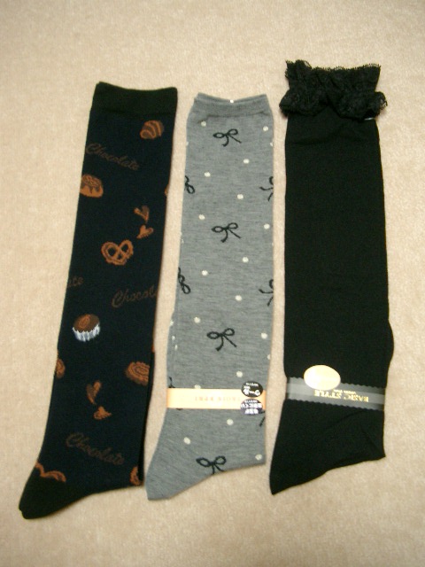右端の、レースが付いた黒い靴下を買いに行ったのですが(前のがダメになったので)、左端の靴下に一目惚れ…!