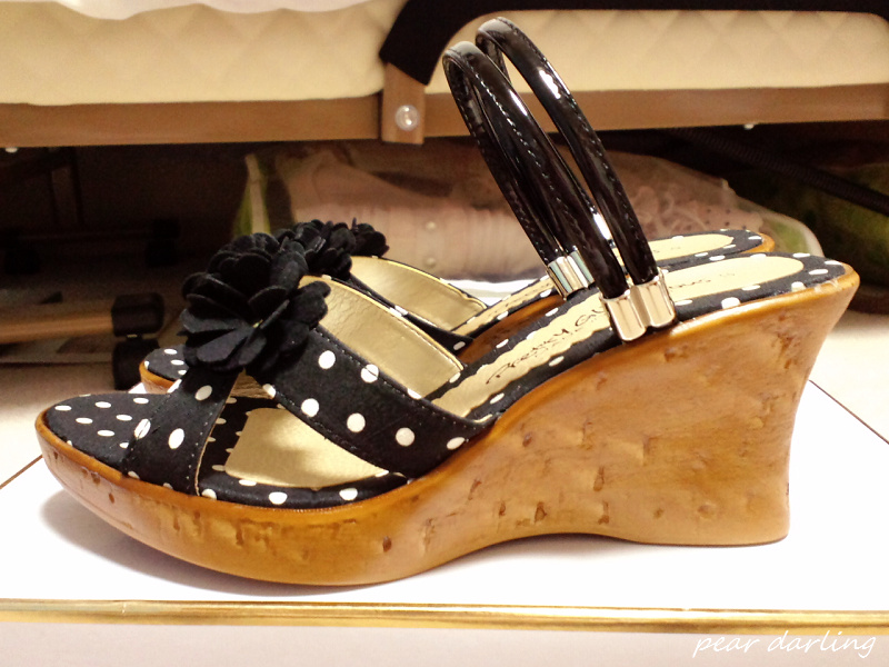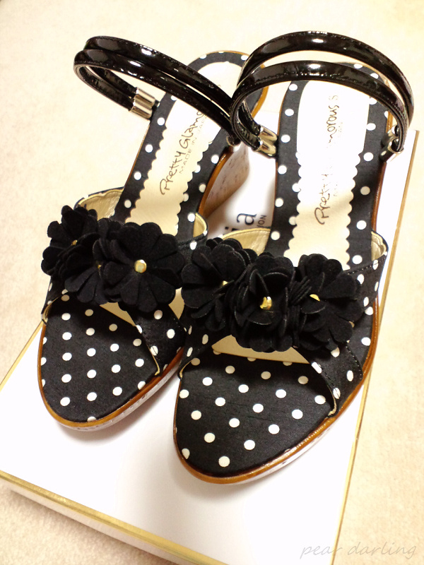 コサージュ付きドット柄サンダル黒×白のドット柄サンダル♪