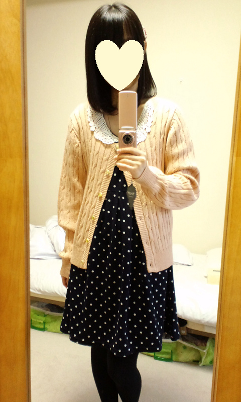 11/25のコーデネイビーのドット柄ワンピに、買ったばかりのピンクのニットカーデを合わせました♪