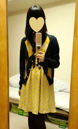 からし色の花柄ワンピに、紺のカーデとボルドーのタイツを合わせてレトロコーデ♪
