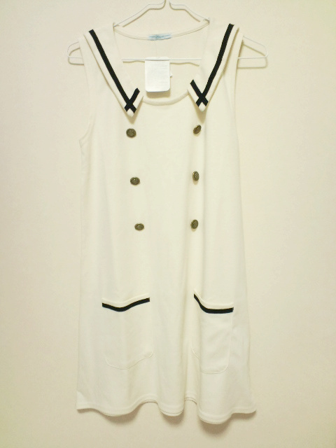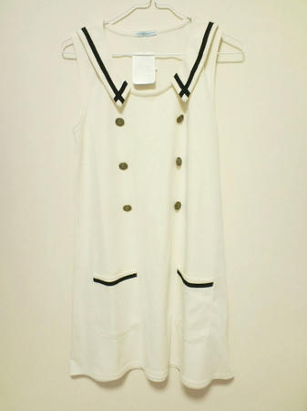 前から見ると白×黒ラインのマリンワンピで、ダブルボタンでかっちりした感じに。
