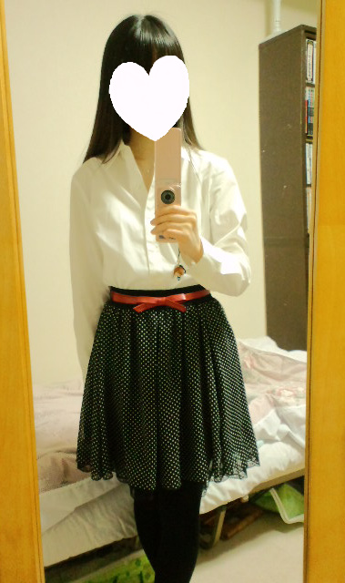 今日(28日)のコーデドットスカートに白シャツを合わせてみました。