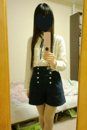 ネイビーのハイウエストショーパンに、9日と同じaxesのブラウスを合わせました。