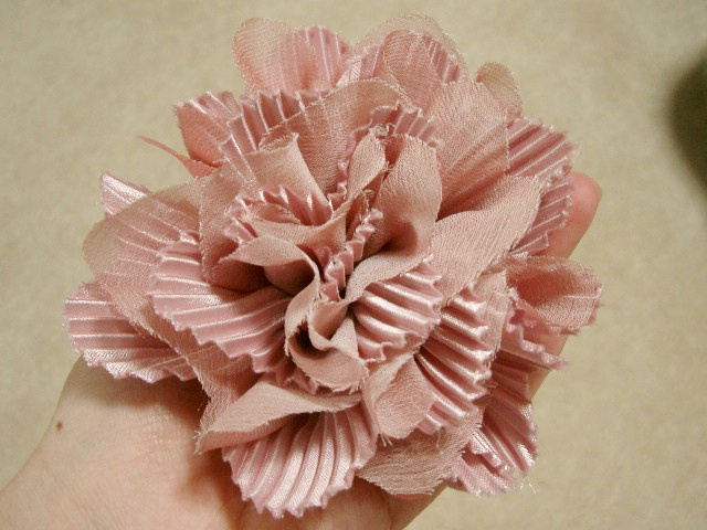 黒のコサージュが2つ付いたカチューシャと迷ったけど、写真撮るには黒より色の方がいいかな、と思って。